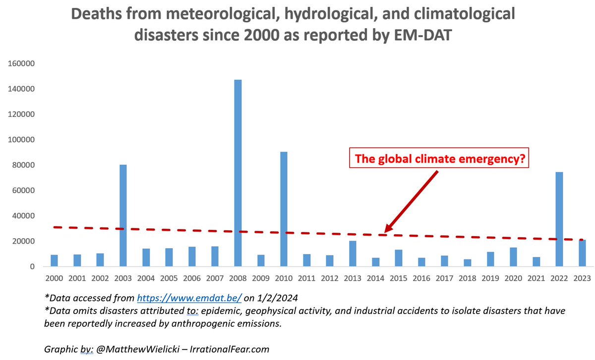 The anonymous video is a rather tiresome complaint that Lomborg prepared the data incorrectly and presented it incorrectly, the narrator’s arguments don’t hold water. It is very clear that no matter how the data are presented, deaths from extreme weather have decreased radically since the early twentieth century. One could quibble about the classifications of the deaths by EM-DAT or the data prep forever, but the underlying idea is sound. For another look at the same data by Dr. Matthew Wielicki, but only the highest quality portion from 2000 to the present, see here. Besides, Lomborg’s paper is peer-reviewed, and we don’t even know who Bonus or the narrator in the video are. I’ll take peer-reviewed over anonymous drivel any day.